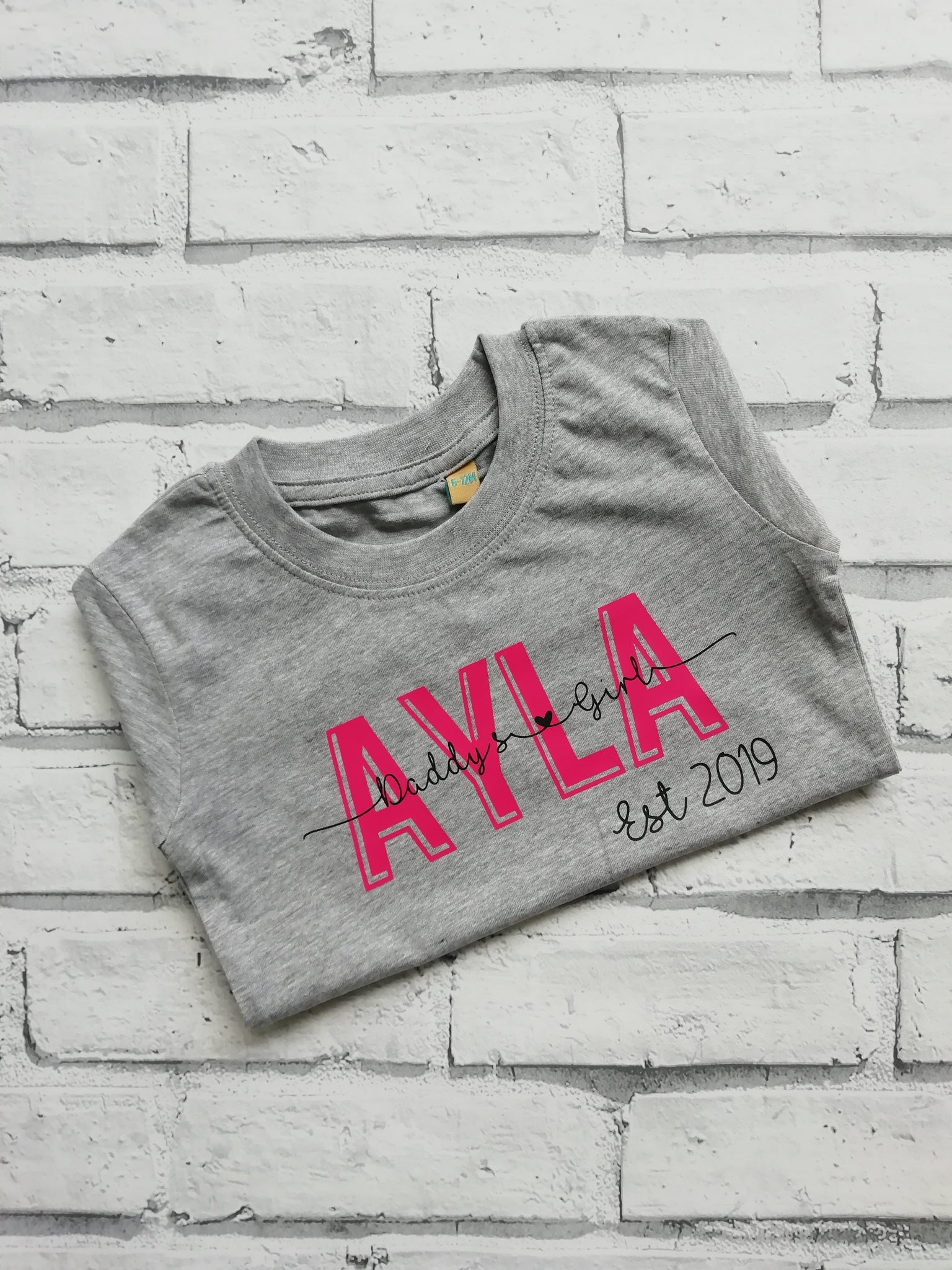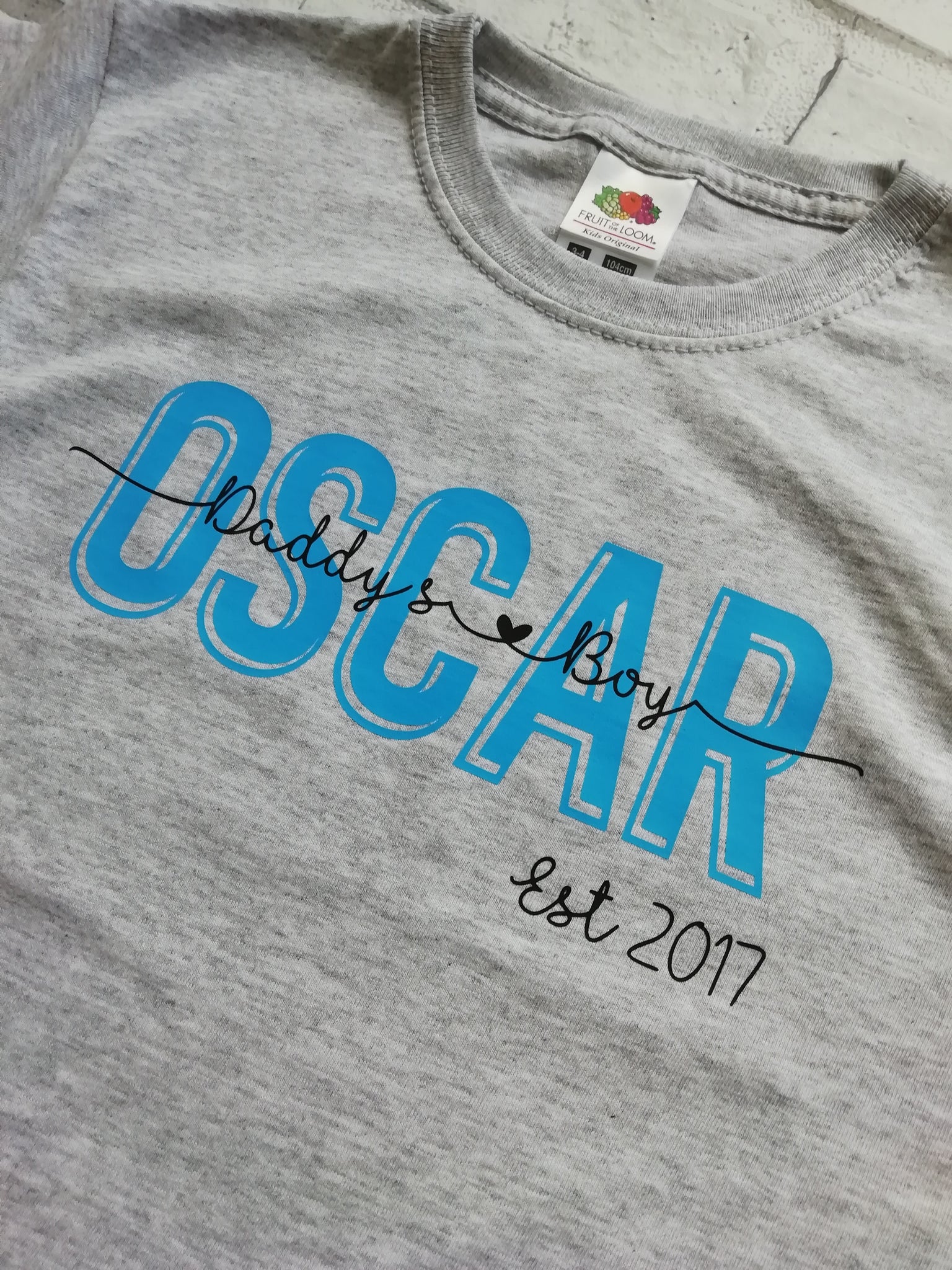 Personalised childrens name tee with established date. Created using Vinyl printing techniques to ensure the designs becomes a part of the fabric and has a soft, high quality finish.